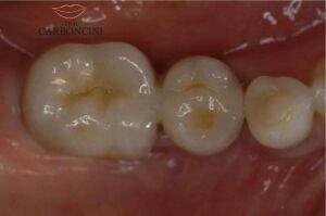 La paziente era portatrice di protesi parziale rimovibile , ma desiderava liberarsene . La quantità e qualità di osso a disposizione resero possibile l’inserimento di due impianti e la loro immediata protesizzazione (carico immediato) . Restauro protesico eseguito con due impianti e due corone in metalceramica.