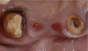 Fallimento di una protesi fissa per frattura del canino e carie delle radici del molare . I due denti furono estratti e sostituiti con tre impianti per realizzare una nuova protesi fissa .