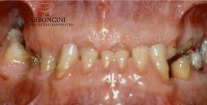 Il paziente presentava una situazione gravemente compromessa in entrambe le arcate per carie destruenti e malattia parodontale. Furono curati i denti e le gengive , e inseriti alcuni impianti nell’arcata superiore.